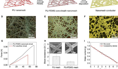 在实验过程中,该团队首先静电纺 PU(聚氨酯)纳米纤维来制造长而毛发状的纤维,以形成可渗透纳米网传感器的骨架。在下一步中,他们将 PU 纳米纤维片浸入稀释的 PDMS(聚二甲基硅氧烷)纳米纤维溶液中,形成被 PDMS 包围的随机束。王等人。将材料暴露在温和的紫外线 (UV) 臭氧下以固化表面并促进表面亲水性(喜水性质)以实现生物相容性。他们在两侧使用金沉积完成了该装置,并使用扫描电子显微镜观察了所得的 PU-PDMS 芯鞘(SEM)。PDMS 涂层增强了纳米纤维之间的互连性,以改善构造的结构完整性。与裸纳米纤维片相比,独立式 PU-PDMS 纳米网的机械强度大大提高,具有更大的拉伸性,该团队还检查了其透气性。