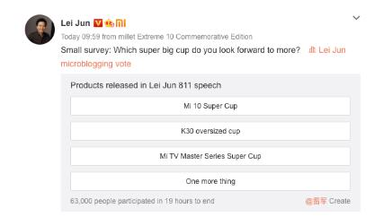 雷军在他的微博账户上进行了一项民意调查,询问人们他们最感兴趣的产品,在这些选项中,还有“一件事情”获得了最多的选票。这暗示该公司将在活动中揭晓另一个惊喜。